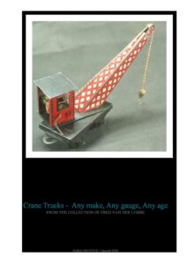 The added play value of cranes with toy and model railways resulted in many of the train manufacturers making crane trucks in their range. This small catalogue contains all crane trucks from my collection; I do have some cranes which are not on wheels, these are catalogued in my book Tin Train Accessories. I have cranes in various gauges and scales of different brands. The catalogue is organized on the countries the toy or model crane originates from and further on Gauge and maker.
